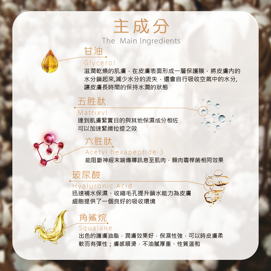 【主成分】甘油、五胜肽、六胜肽、角鯊烷、玻尿酸